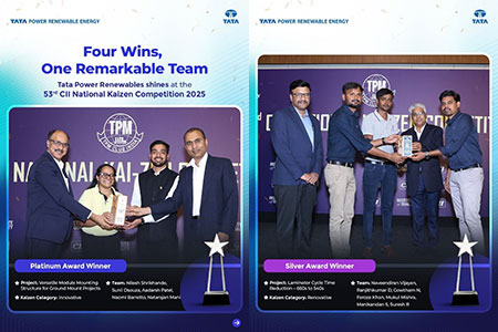 Tata Power Renewables has bagged three platinum awards at the CII National 3M Kaizen competition. TP Solar has been recognized under the 3M MUDA category for its project on Soldering Defect Reduction to Improve Productivity & Quality at the 1GW line. Additionally, team SCM received the accolade under the 3M MURA category for developing a SCM Costing Model that improved cycle time from 10 days to just 1 day. The Tata Power Renewables Engineering team was honored in the MURI category for their work on reducing cycle time by automating processes in AutoCAD and Excel. Such accolades highlight Tata Power Renewables commitment to continuous improvement and technological advancement, pushing the boundaries of innovation.